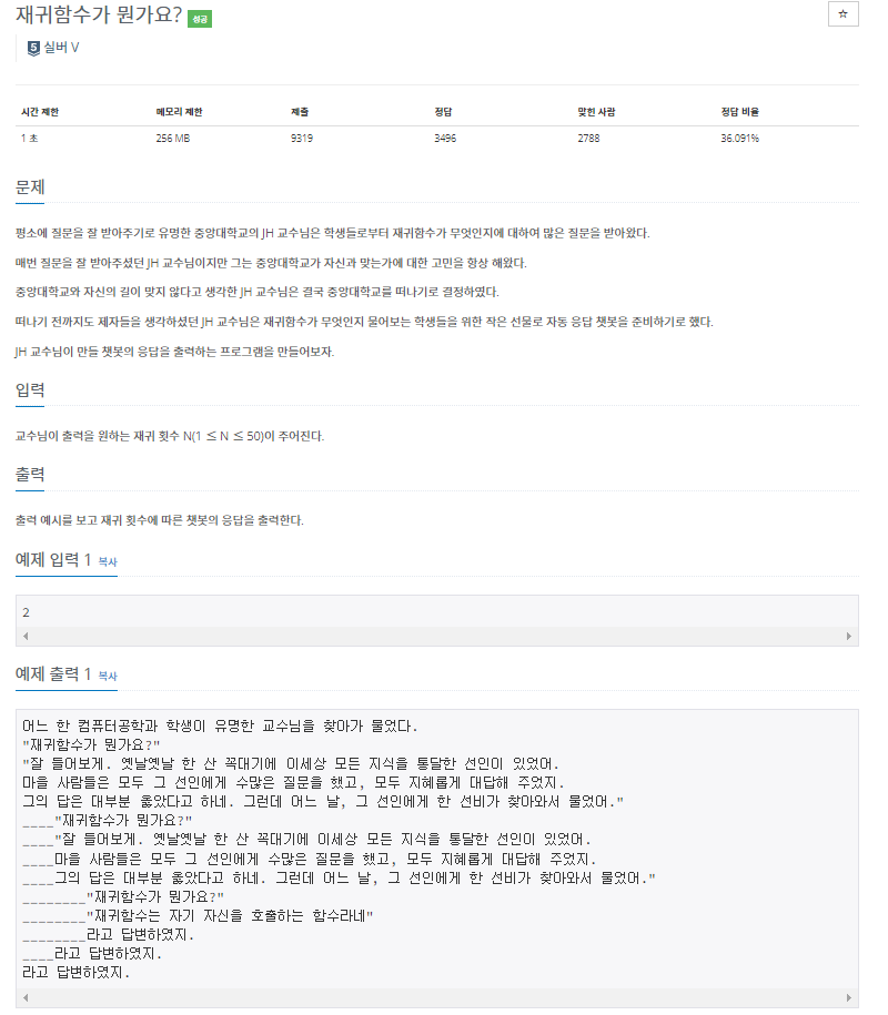 import java.util.Scanner; public class Main { public static void main(String[] args) { Scanner scanner = new Scanner(System.in); int n = scanner.nextInt(); scanner.close(); System.out.println("어느 한 컴퓨터공학과 학생이 유명한 교수님을 찾아가 물었다."); recursion(n, 0); } public static void recursion(int n, int recursionCount) { StringBuffer sb = new StringBuffer(); for (int i = 0; i < recursionCount; i++) { sb.append("____"); } String prefix = sb.toString(); System.out.println(prefix + "\"재귀함수가 뭔가요?\""); if (n == recursionCount) { System.out.println(prefix + "\"재귀함수는 자기 자신을 호출하는 함수라네\""); System.out.println(prefix + "라고 답변하였지."); return; } System.out.println(prefix + "\"잘 들어보게. 옛날옛날 한 산 꼭대기에 이세상 모든 지식을 통달한 선인이 있었어."); System.out.println(prefix + "마을 사람들은 모두 그 선인에게 수많은 질문을 했고, 모두 지혜롭게 대답해 주었지."); System.out.println(prefix + "그의 답은 대부분 옳았다고 하네. 그런데 어느 날, 그 선인에게 한 선비가 찾아와서 물었어.\""); recursion(n, ++recursionCount); System.out.println(prefix + "라고 답변하였지."); } }- 재귀를 통해 답변을 출력하고, 재귀의 마지막에는 다른 답변을 출력한다.