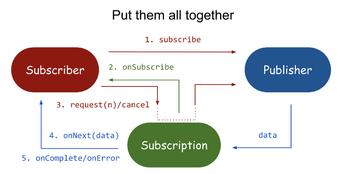 - Subscriber -> Subscription -> Publisher: Subscription의 request 함수를 통해 Publisher에게 요청