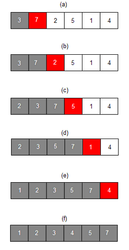 - 예) [1, 3, 5, 2, 4] 배열에서 원소 "2"는 이전의 원소 "5"보다 작으므로 자리교환 -> [1, 3, 2, 5, 4], 그 이전의 원소 "3" 보다 작으므로 자리교환 -> [1, 2, 3, 5, 4]